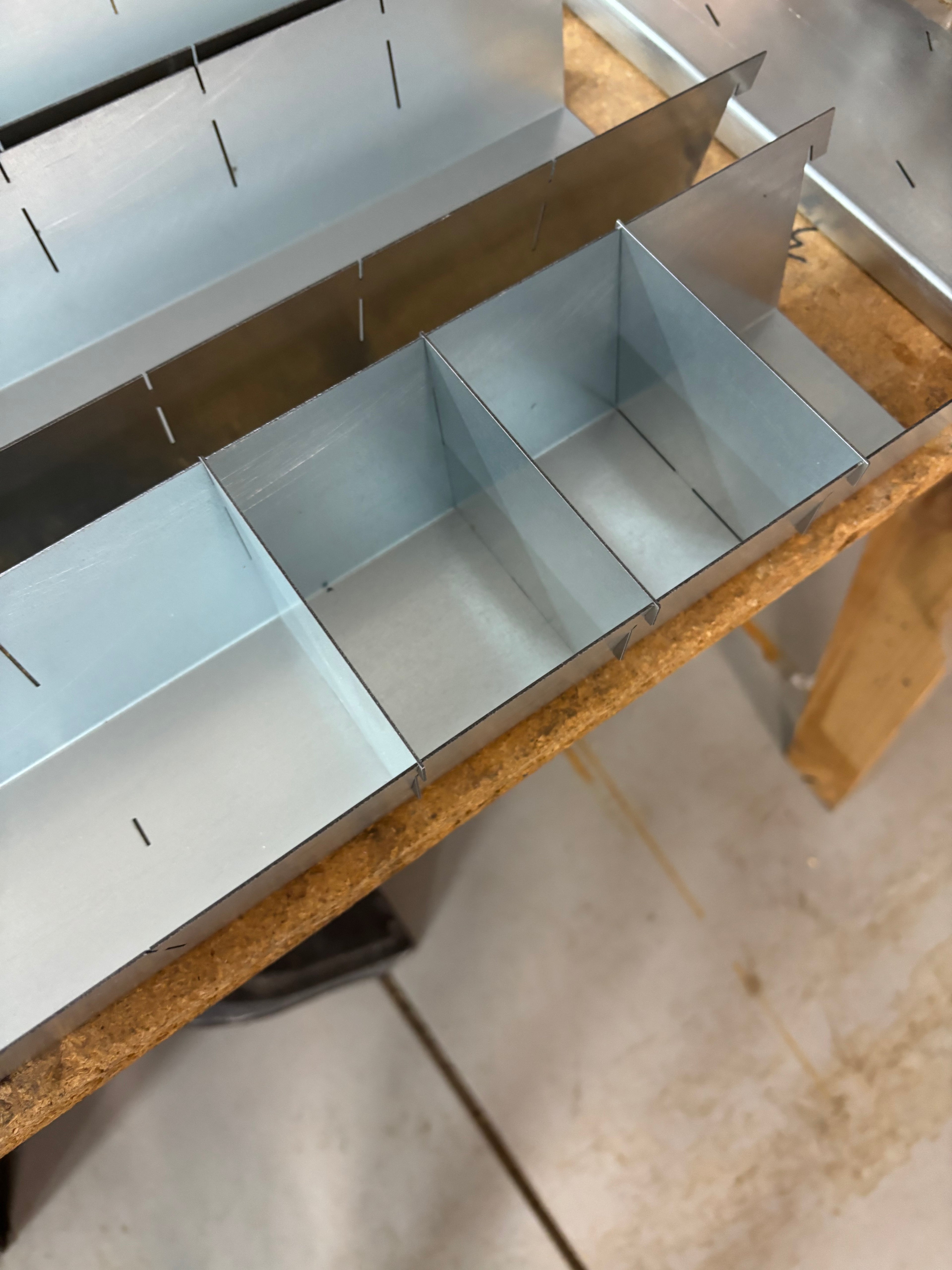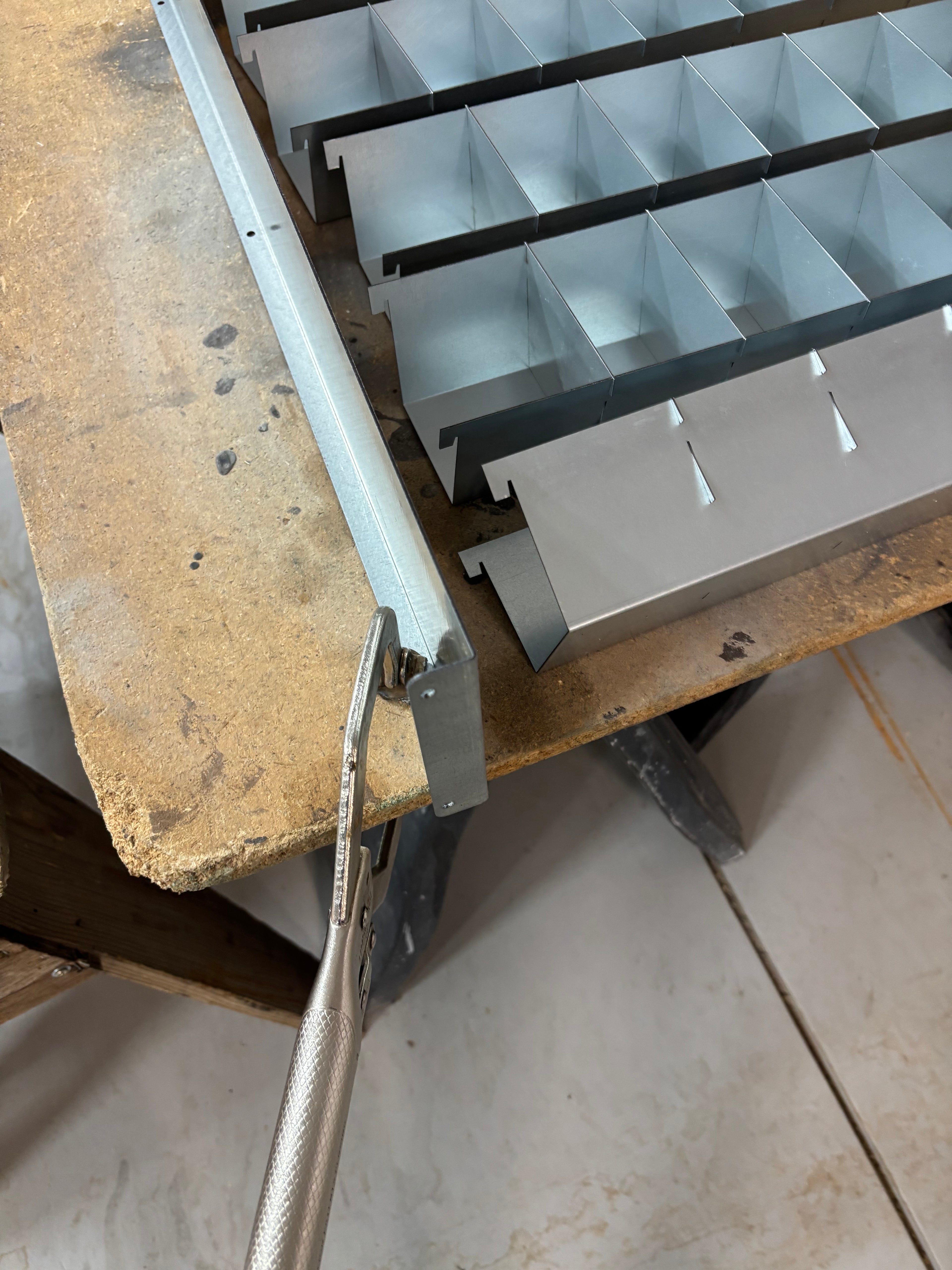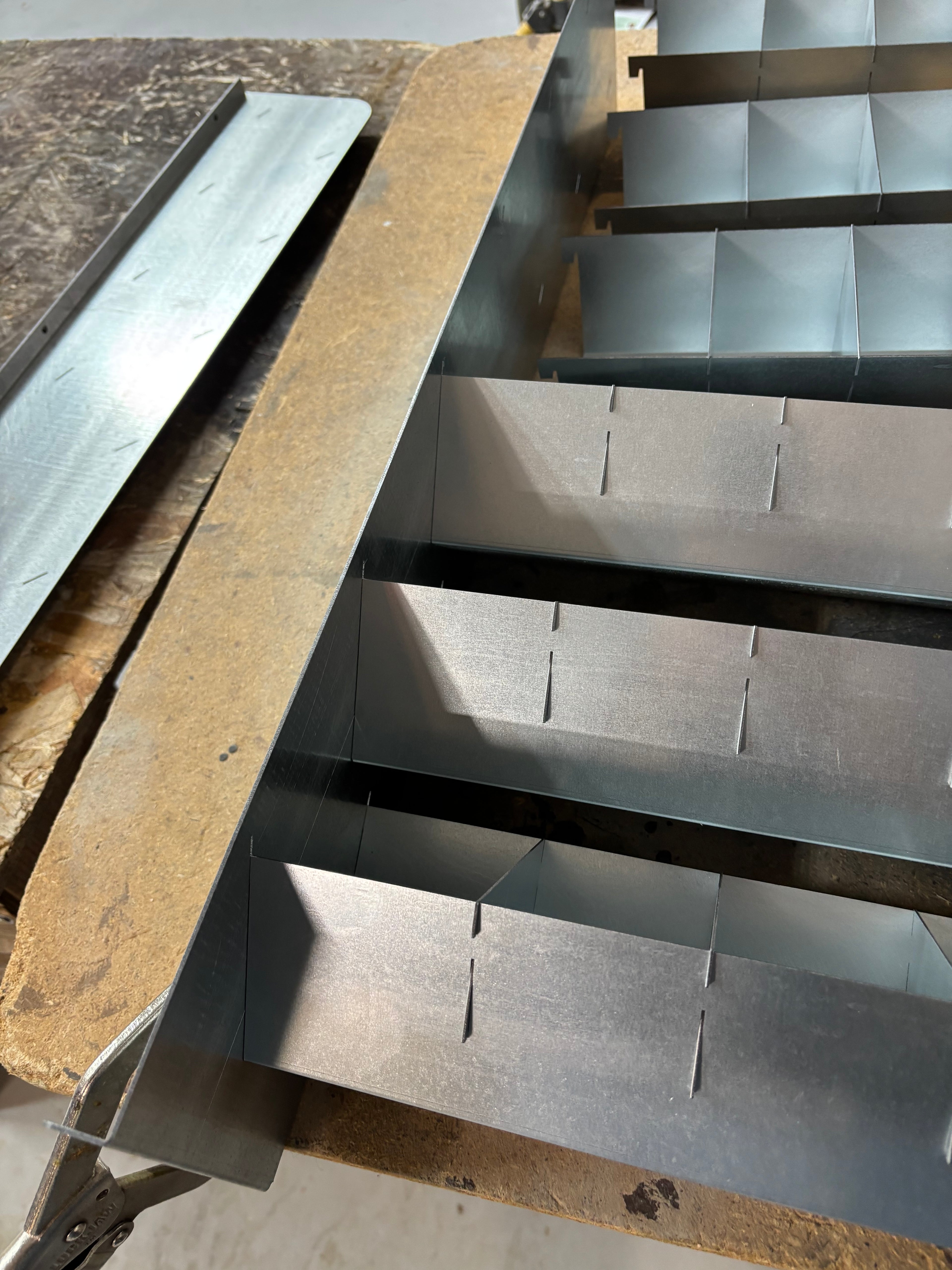 Fasten to bench with standard hardware depending on bench material. Removable dividers for wider bins. Small footprint preserves valuable floor space.