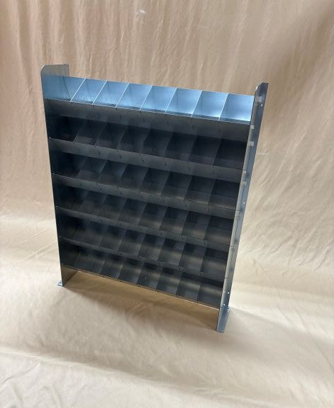 The Snap Bins Base Module mounted on an OSB wall. Add Base Modules to add more bins. Fasten to wall with standard hardware depending on wall material. Base Module has (8) bins across and (6) vertical. Removable dividers for wider bins. Ideal for organizing and storing small parts or fasteners.